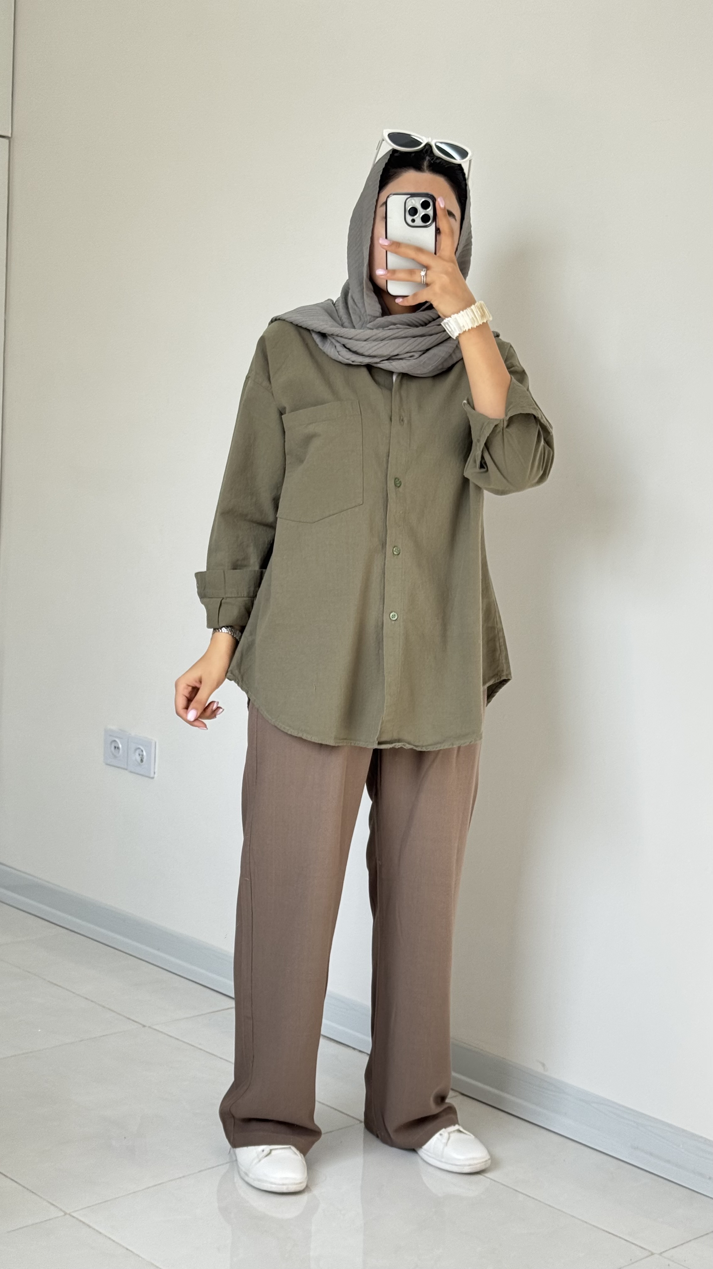 رنگ زیتونی : قد ۷۳ / دورسینه ۱۱۸ / دور باسن ۱۲۴ / قد آستین ۴۹ / دور بازو ۴۸