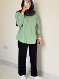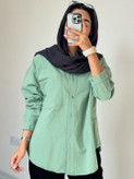 رنگ پسته ای : قد ۷۳ / دورسینه ۱۱۴ / دور باسن ۱۲۳ / قد آستین ۴۹ / دور بازو ۴۹