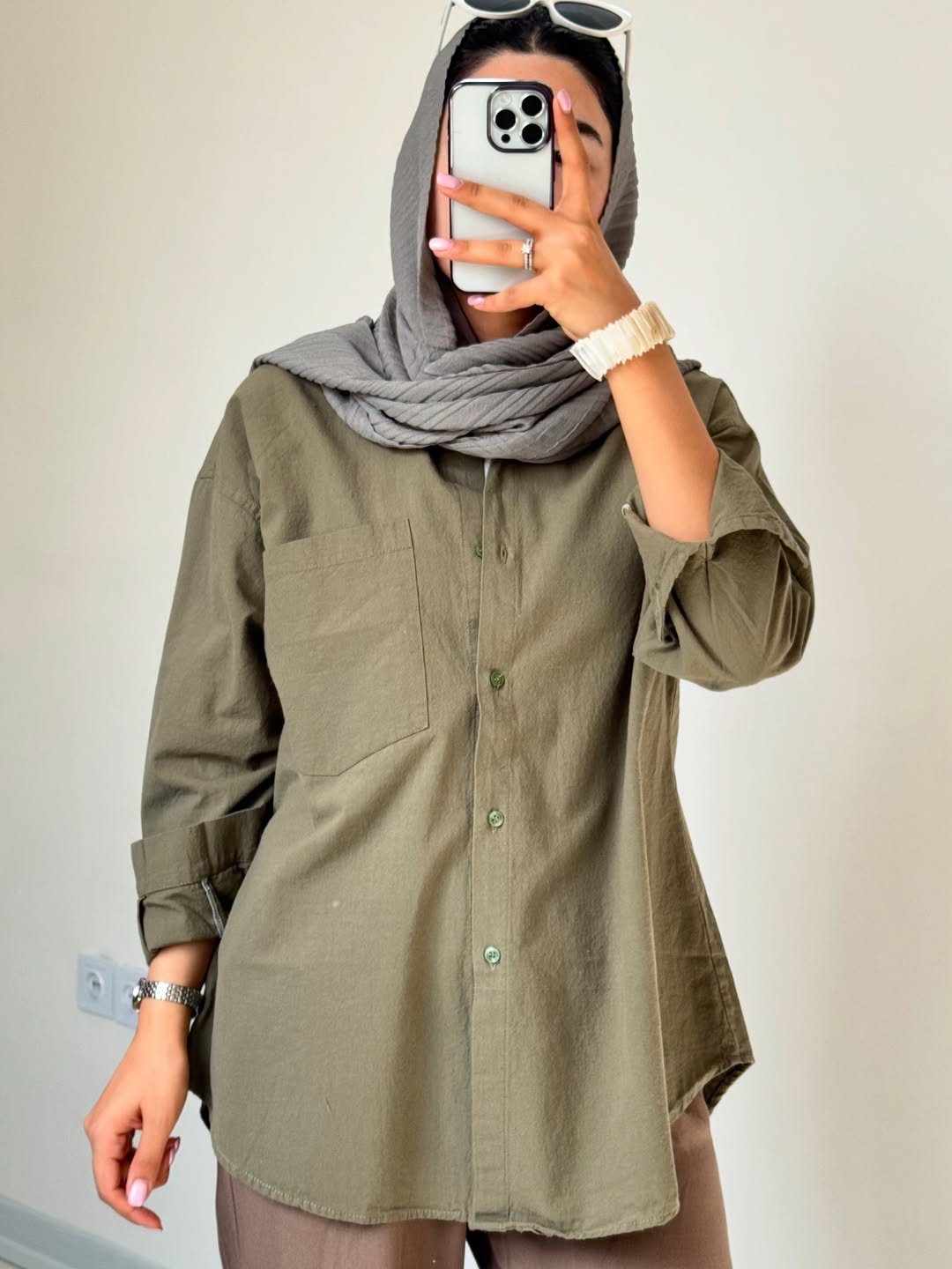 رنگ زیتونی : قد ۷۳ / دورسینه ۱۱۸ / دور باسن ۱۲۴ / قد آستین ۴۹ / دور بازو ۴۸
